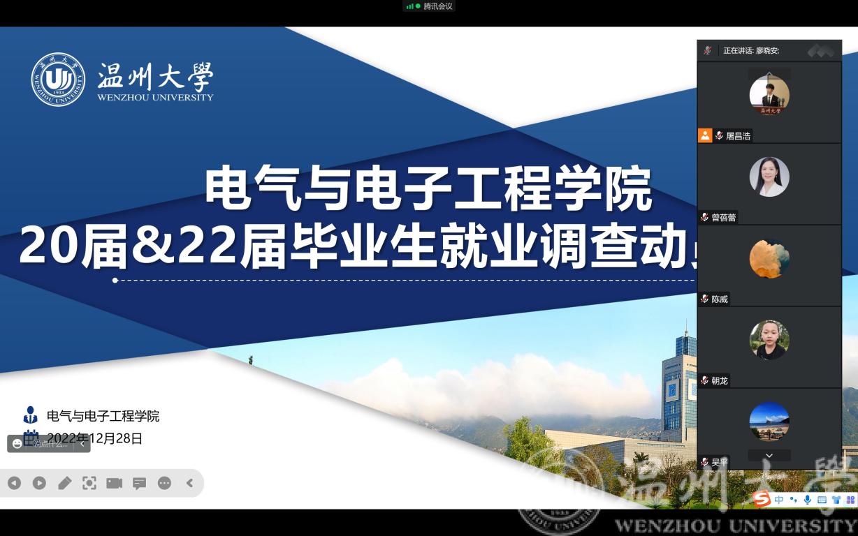 12月28日下午2:00,区块链游戏 召开20届与22届毕业生就业调查动员大会线上会议。副院长陈孝敬、党委副书记曾蓓蕾、电气系主任吴平、电子系主任庄友谊、学工办主任廖晓安以及20届与22届各毕业班班主任参会,会议由学工办就业辅导员屠昌浩主持。