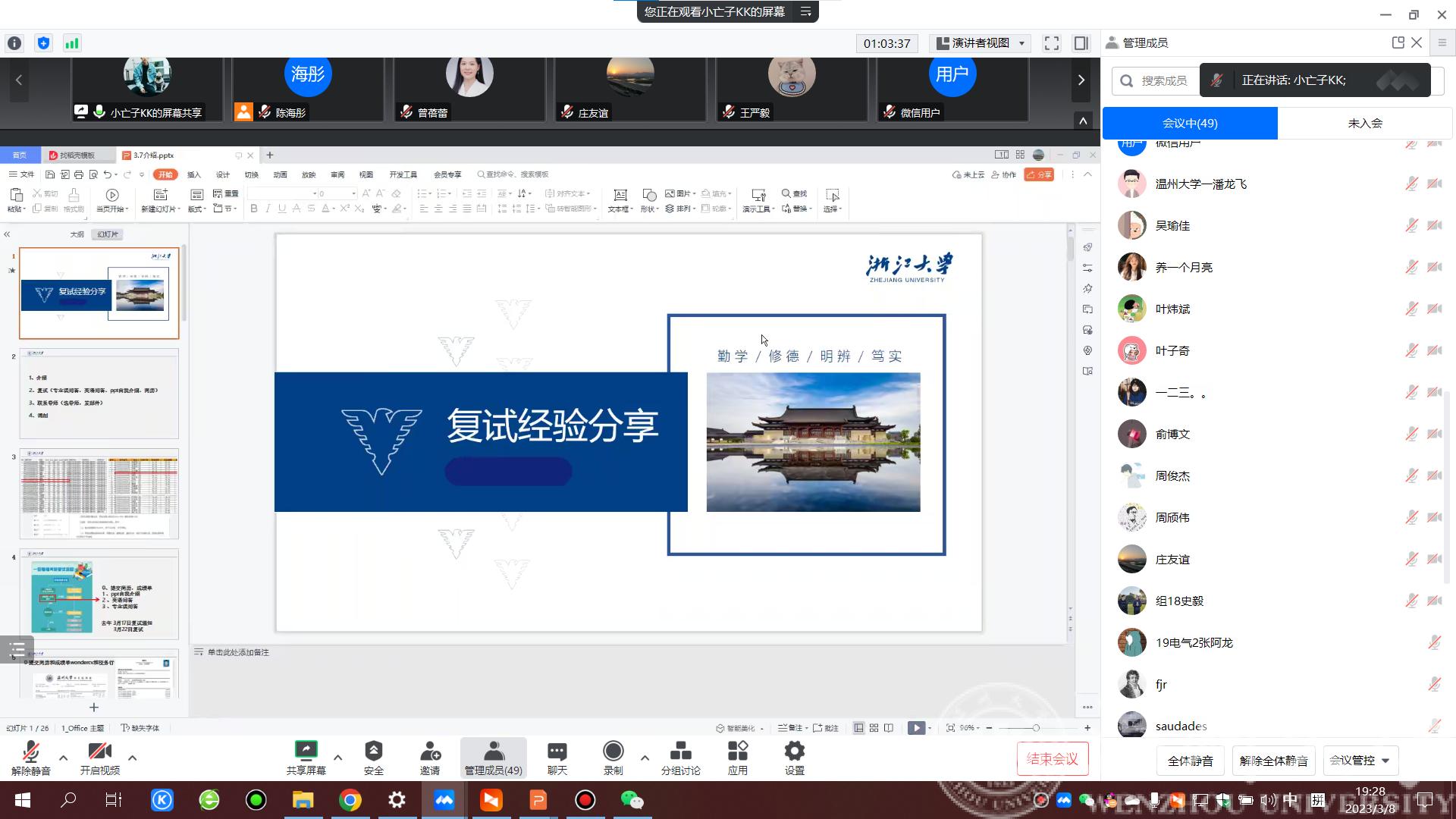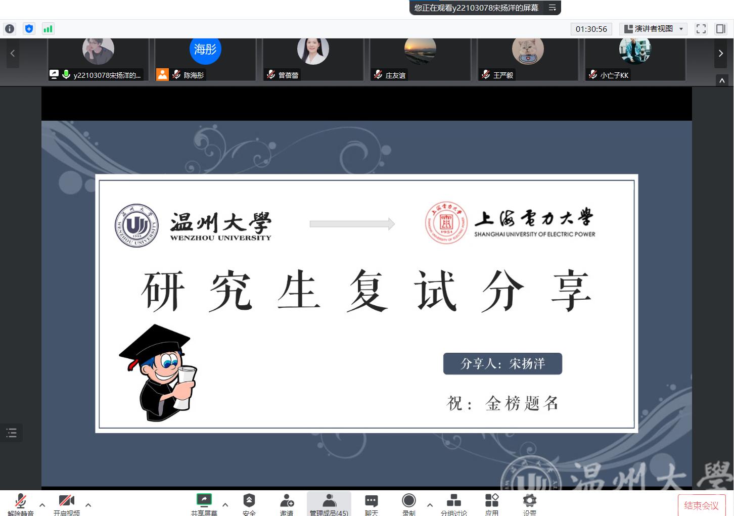 随后,2022届毕业生袁舸凡、宋扬洋和2021届毕业生林怀周三名优秀校友以自身复试经历为例,和学弟学妹们分享了自己复试和调剂的经验。考取浙江大学的袁舸凡同学分享了自己当时的复试流程以及专业课问答的要点;上海电力大学的宋扬洋同学就上电的复试内容和形式进行介绍,提醒学弟学妹们及时联系导师。桂林电子科技大学的林怀周同学讲述了自己读研期间的感悟,在联系导师、把握调剂机会等方面给出了相关建议。