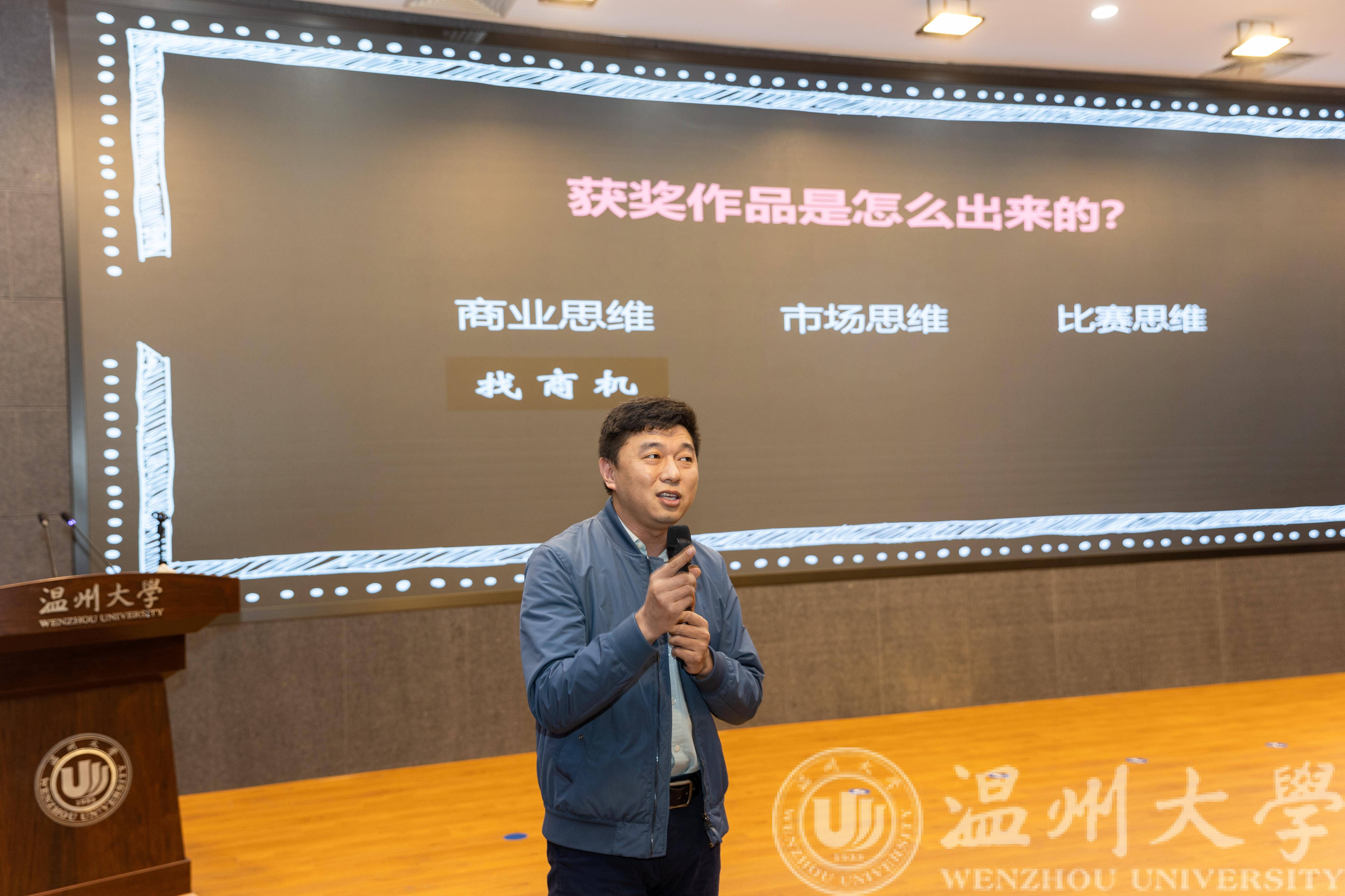 温州市教育局高教处——潘乐慧副处长宣讲在校大学生创新创业政策,潘处长对于大学生为什么要创业,有哪些创新创业的企业等问题做出了详细的回答,并对温州市对大学生创业的政策进行了讲解。