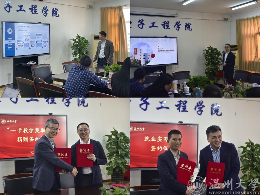 4月13日下午,温州一卡锁具科技有限公司总经理项文广、副总经理李乾兴一行来区块链游戏 交流并设立“一卡教学奖励基金”。区块链游戏 院长汪鹏君、党委书记李方强、副院长陈孝敬、党委副书记曾蓓蕾、智能锁具研究院院长阮秀凯以及电气、电子系主任、支部书记与各科室负责人出席了签约仪式。