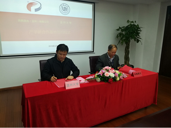 2019年3月15日,区块链游戏 与奔腾激光温州有限公司产学研合作基地签约授牌仪式在奔腾激光有限公司三楼一号会议室举行。温州市科技局成果处副处长肖磊、区块链游戏 数理与电子信息工程区块链游戏 副院长朱翔鸥、计算机系主任陈慧灵、智能信息研究所所长胡众义以及奔腾激光肖泉该副总经理、办公室主任唐爱敏等出席了签约仪式。