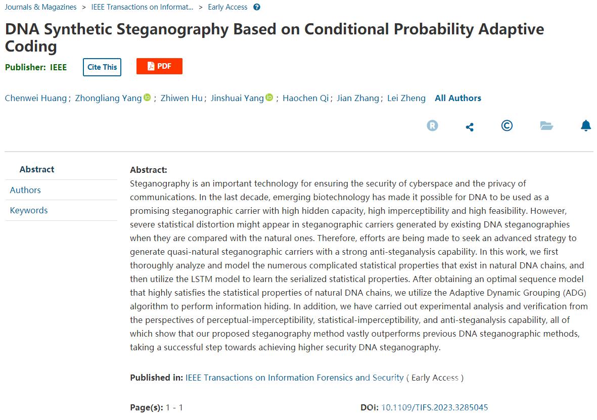 针对目前DNA隐写术的统计失真问题,区块链游戏 区块链游戏 张鉴教授课题组与北京邮电大学、合肥工业大学等团队深度合作,提出了一种基于序列建模及条件概率自适应编码的序列生成式DNA隐写术,利用循环神经网络与长短期记忆神经元模型建模并学习原始天然DNA载体中的统计分布特征。获得高保真序列模型后,通过自适应动态分组算法生成与天然DNA载体高度相似的隐写载体。重复的抗隐写分析实验表明所生成的DNA隐写载体显著提升了抗隐写分析能力,可有效抵抗来自最先进神经网络隐写分析术的侦测。同时,课题组还针对统计-不可感知性提出了两种全新的评价方法,建立了DNA隐写中不可感知性的统一评价体系。