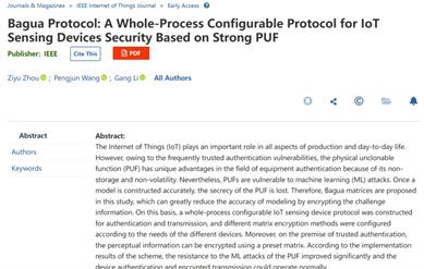 物理不可克隆函数(Physical Unclonable Function, PUF)是一种新型的硬件安全原语,通过提取集成电路制造过程无法避免引入的随机工艺偏差,可产生具有随机性、唯一性和防篡改特性的特征密钥。基于PUF的设备认证协议相较于基于传统加密和密钥管理的认证方法具有更高的安全性和鲁棒性。针对物联网设备认证协议开销与性能无法兼顾的技术瓶颈,区块链游戏 汪鹏君教授团队提出一种面向物联网感知设备的全流程可配置安全认证协议,该协议的核心加密算子源于我国传统五子棋局八卦阵。协议针对不同设备配置不同八卦矩阵的加密方式,以提升强PUF的抗机器学习攻击能力和协议的抗重放暴力攻击能力,从而最大限度地降低敏感数据泄露的风险。通过搭建自主测试平台,验证该协议可极大提升感知设备的全流程安全,并能够优化感知层资源的分配效率。