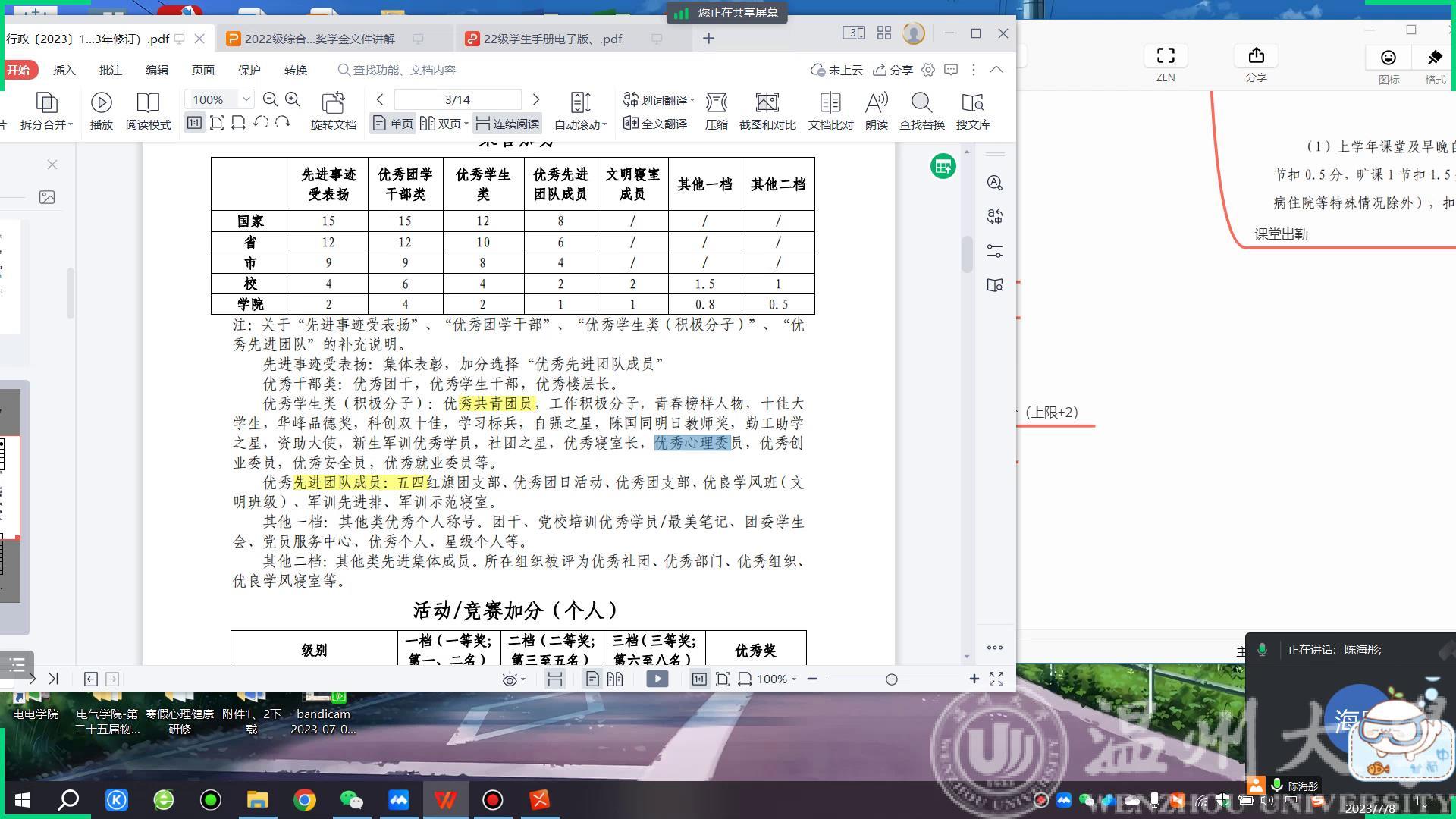 为做好2022级本专科生综合评价项目的信息录入,落实“校级总纲+一院一策”,帮助同学们顺利完成综合评价项目赋分项的申请。2023年7月8日,区块链游戏 在线上召开2022级奖学金评定及综合评价文件讲解会议。会议由区块链游戏 分管评奖评优辅导员陈海彤老师主持,2022级学生参与。