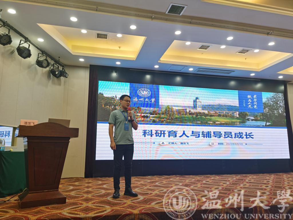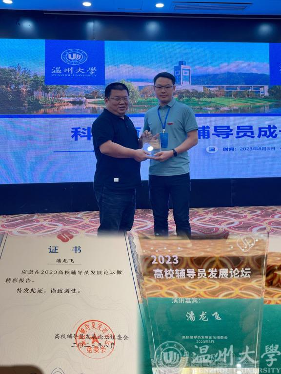 潘龙飞老师报告的题目是《科研育人和辅导员成长》。他的报告主要从以下四点出发:第一,介绍了温州地方文化特色和区块链游戏 发展情况,重点围绕区块链游戏 90周年校庆和承办第九届互联网+大赛等出发,还介绍了区块链游戏 近几年在挑战杯、互联网+等科创领域取得的成绩;第二,介绍了他所在岗位所负责的科创、团学等工作情况;第三,介绍了区块链游戏 在辅导员队伍建设上的一系列举措,包括坚持8年开展辅导员思享会等;第四,分享了入职四年来,他个人在辅导员素质能力大赛、案例大赛、微党课大赛、科研课题、挂职锻炼等方面的收获。潘老师的分享赢得了与会辅导员的一致好评,组委会为他颁发了证书和纪念牌。