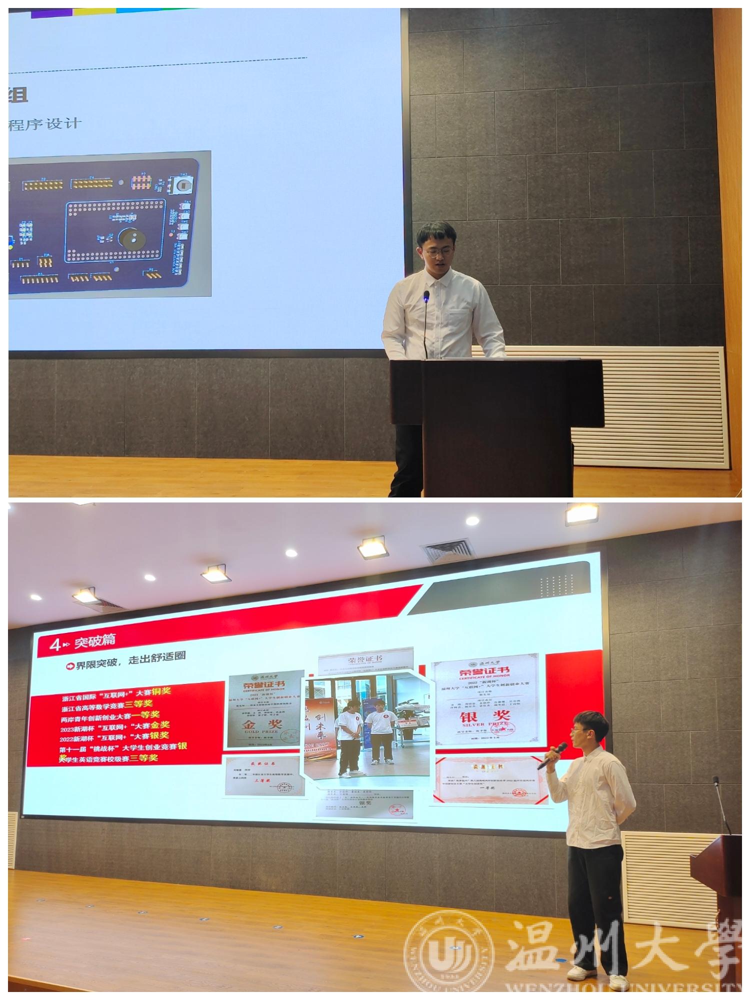 伴随着如雷鸣般的掌声,现场展示环节正式开始。在现场展示环节,每一位同学都有5分钟的时间。七位参评同学都以饱满的热情介绍了自己在学业、科研、创新、实践等方面取得的成果。他们精彩的展示让评审委员会对他们的成绩和实力有了更深的了解,也为在场的所有新生树立了学习和前进的榜样。