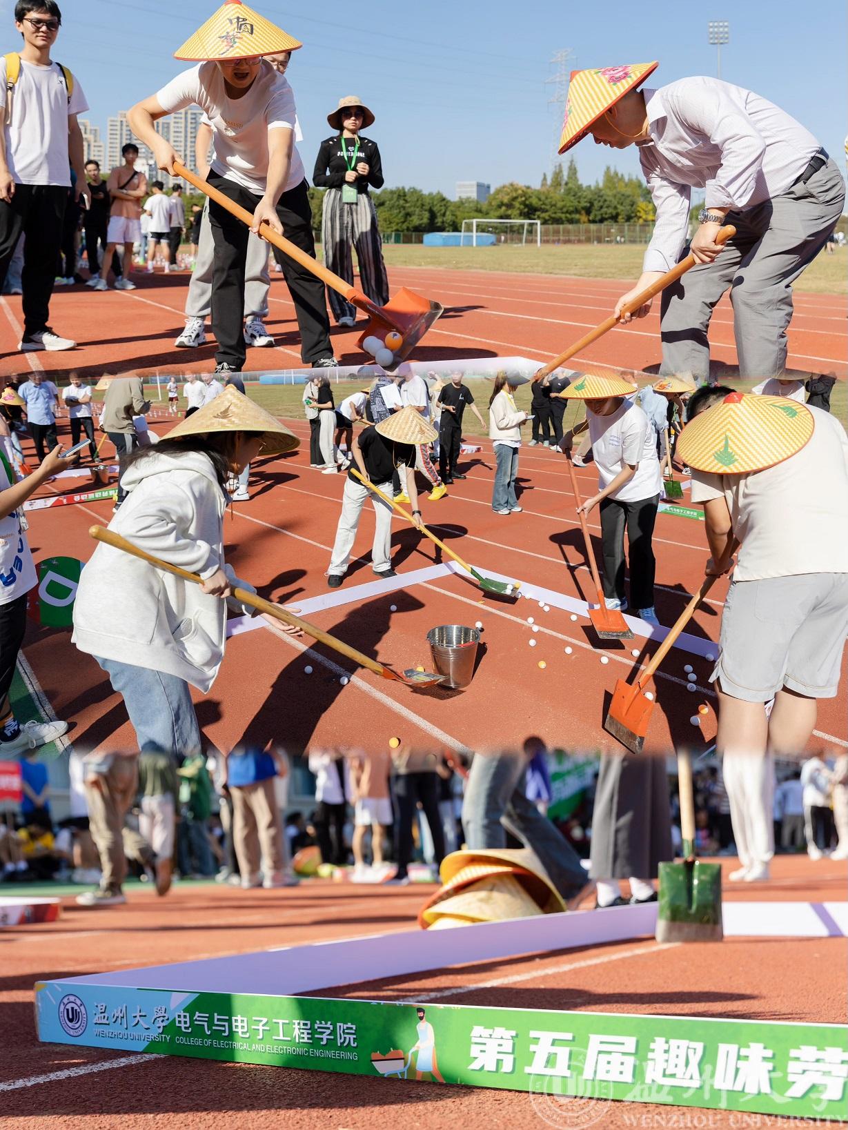 此次,师生劳动趣味运动会项目的设置,以“田园劳作”为主题,借鉴了农民整地、播种、浇水、收获的工作流程。首先开始的是整地大比拼环节。滚动的乒乓球在围栏里四处乱窜,师生们小心翼翼地把持平衡,一不小心乒乓球就会从铁锹头“溜出”。在老师同学们的默契配合之下,小小的乒乓球还是终归是难逃被铲入桶中的命运。