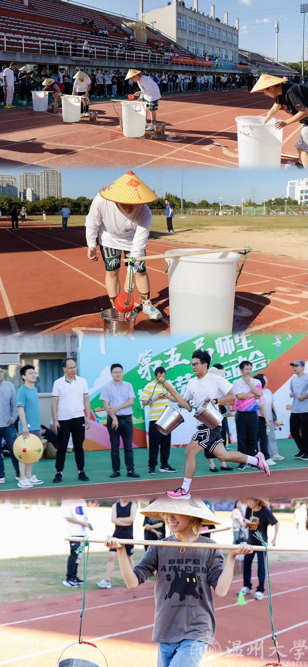 种子播种完毕,就要为他们“浇水”。挑水接力赛模拟了农民伯伯种地浇水的环节。正所谓“一担乾坤肩上下,双悬日月臂东西”,师生们头戴斗笠,肩挑扁担,摇身一变成为“挑水工”,通过逐一接力,将水倒入指定位置。比赛途中虽有挫折,但大家争分夺秒,不抛弃、不放弃。