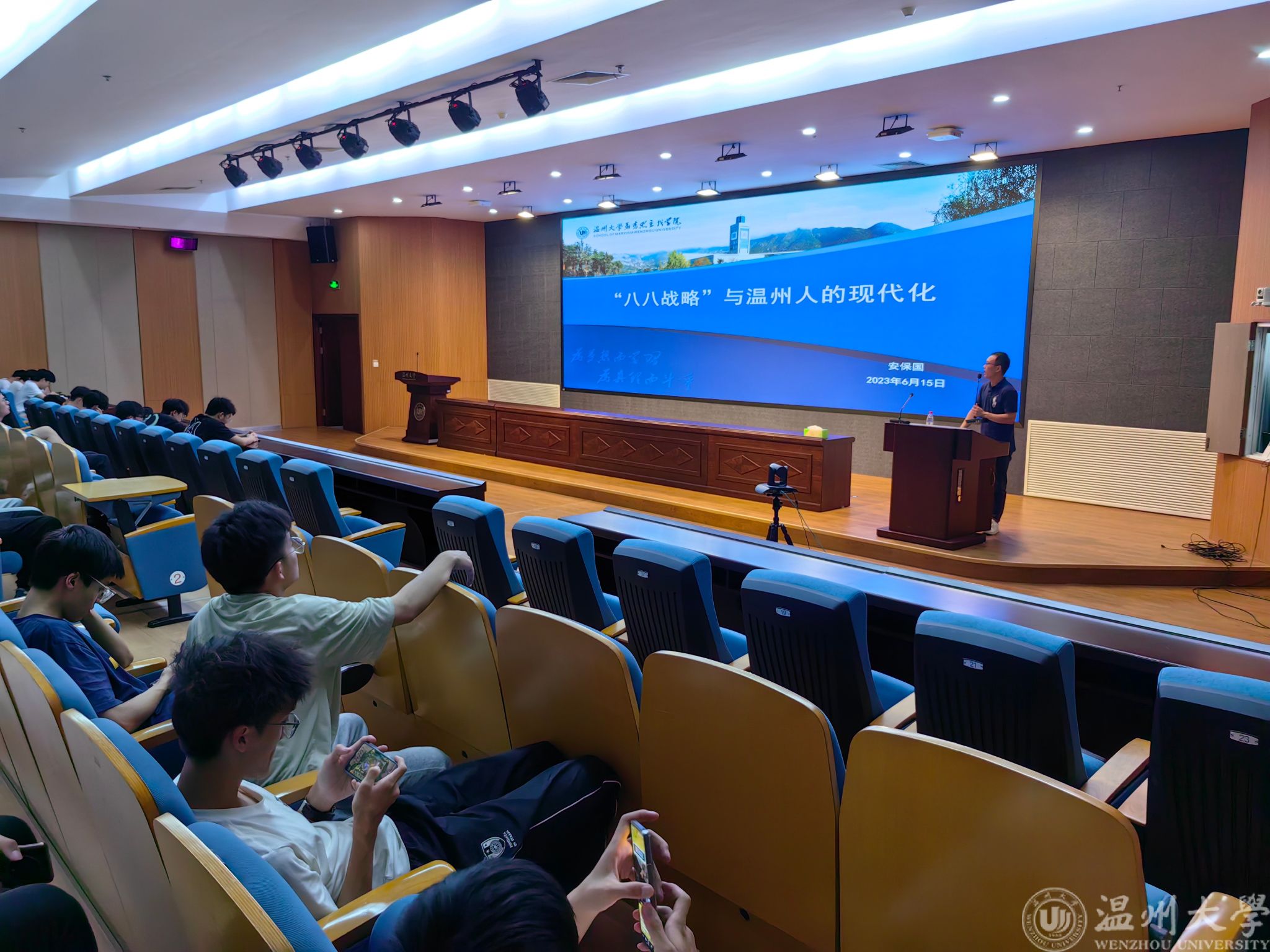 “如何用温州人的现代化践行八八战略”和“如何以温州人的现代化促进八八战略”四个部分,结合温州实际,结合温州特色,用生动的语言,鲜活的案例,把高度精炼的理论讲得通俗易懂,既让在场的同学们深入了解了温州的经济发展和文化底蕴,又让同学们很好的理解了八八战略与温州人的现代化的关系。