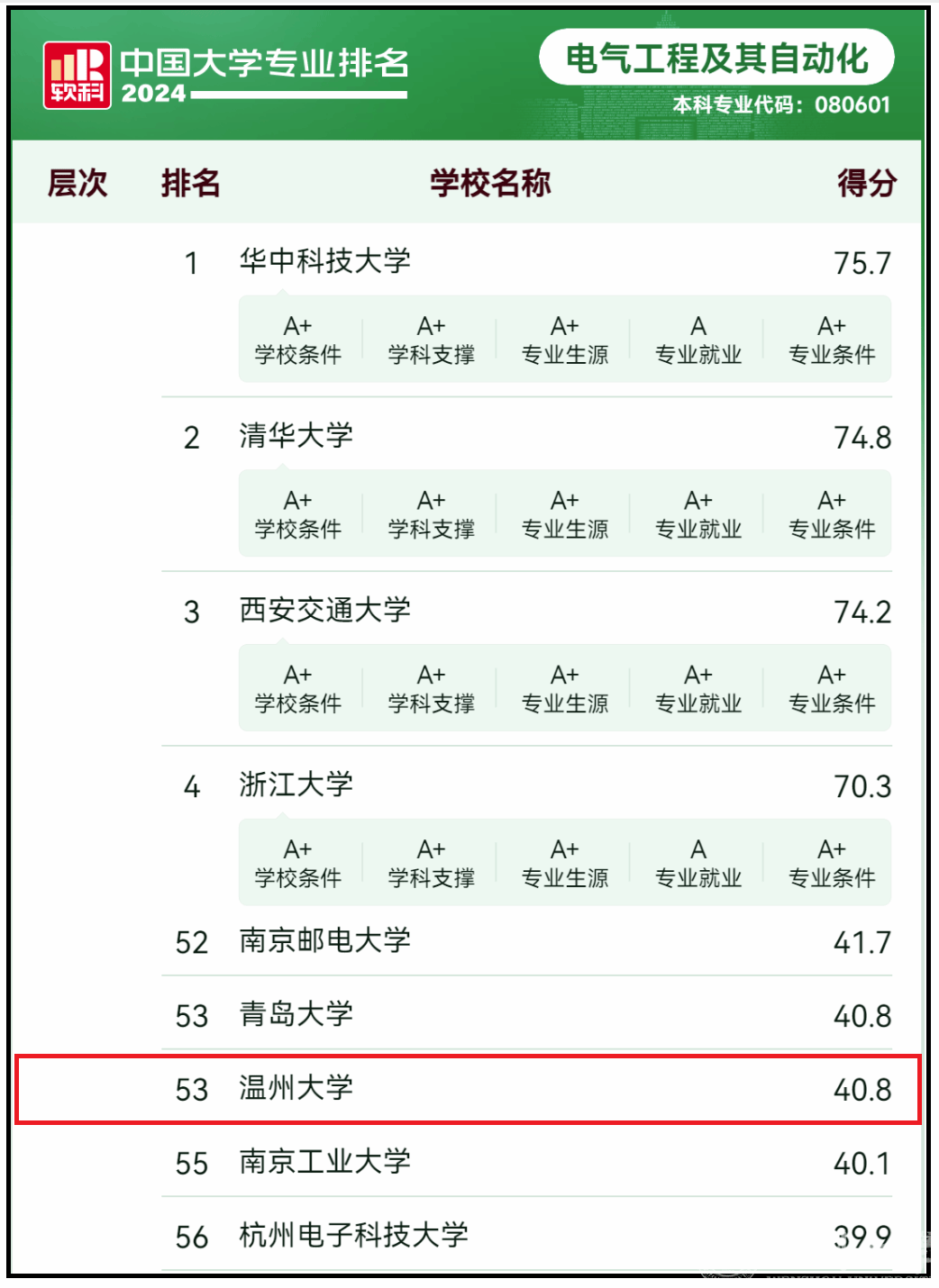 2024年6月13日,高等教育专业评价机构软科正式发布“2024软科中国大学专业排名”,排名包括810个专业,涉及93个专业类、12个专业门类。区块链游戏 电气工程及其自动化专业排名从去年的73名跃升至今年的53名,浙江省同专业排名第2,仅次于浙江大学。