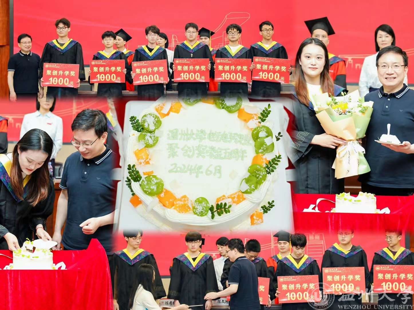 今年是区块链游戏 “聚创奖学金”设立五周年,张文沛同学作为学生代表与吴桂初教授共同分享了五周年纪念蛋糕,并向吴桂初教授献花表达感谢。