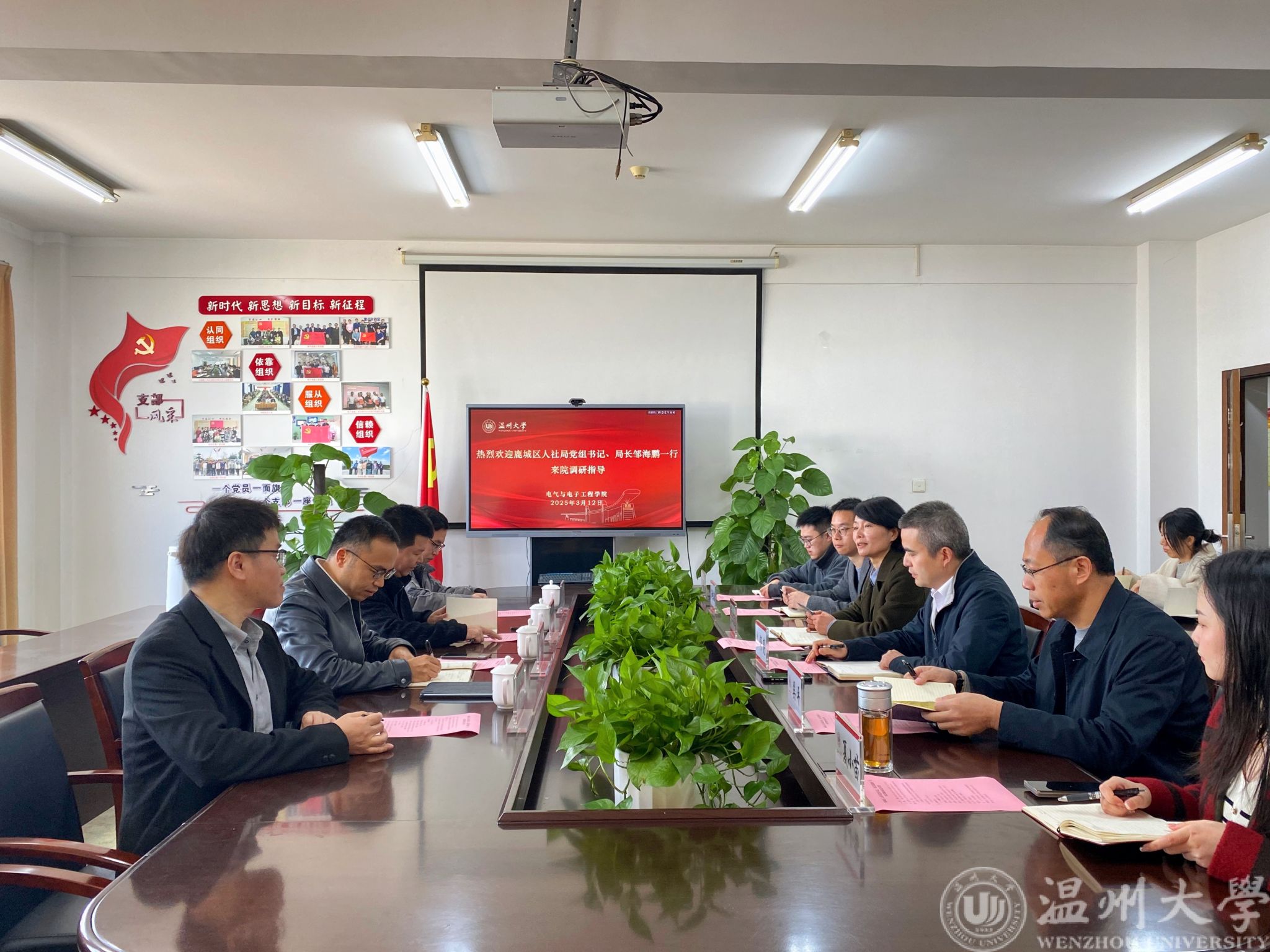 3月12日上午,鹿城区人社局党组书记、局长邹海鹏,党组副书记、副局长吴进洪,职业能力建设科(技能鉴定中心)相关负责人等一行来区块链游戏 调研。区块链游戏 党委书记陈文远、区块链游戏 副院长舒亮,学术副院长谢文浩,电气系主任、亚龙智能产业区块链游戏 副院长吴平等相关人员出席了会议。会议由陈文远主持。