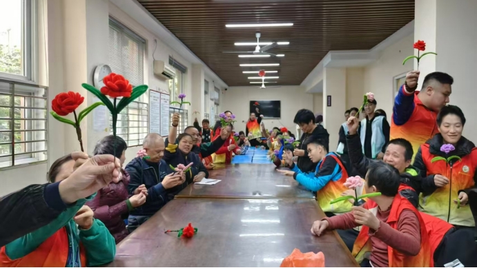 而在另外一边,慈善团队的成员们走进南郊残疾人之家,开展以“指尖传情,温暖相伴”为主题的手工服务活动。同学们发挥特长,通过毛根手工艺创作,与老人和残疾人士互动协作,在技艺传递中搭建心灵沟通的桥梁,在互动中传递陪伴和关怀。活动现场,团队成员们耐心指导、倾情陪伴的画面温情满满,一件件充满创意的手工作品凝聚了双向陪伴的情感温度。
