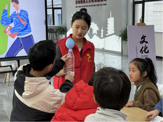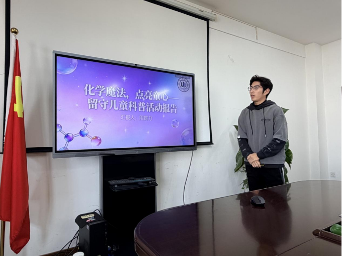 与此同时,一场科普活动汇报也同期举行。“化学魔法,点亮童心——留守儿童科普活动报告”的分享,由汇报人周群力同学带来。活动中,团队成员设计了一系列安全、有趣的简易化学实验,走进社区活动中心,为留守儿童们开启了一扇奇妙的科学之窗。通过“泡沫喷泉”这样看似神奇的“化学魔法”,团队成员们用通俗易懂的语言揭示背后的科学原理,激发孩子们对科学的好奇心与探索欲。汇报通过简单的图片,生动再现了活动现场的惊叹与欢笑。这项活动不仅是一次知识普及,更是一次温暖的陪伴。