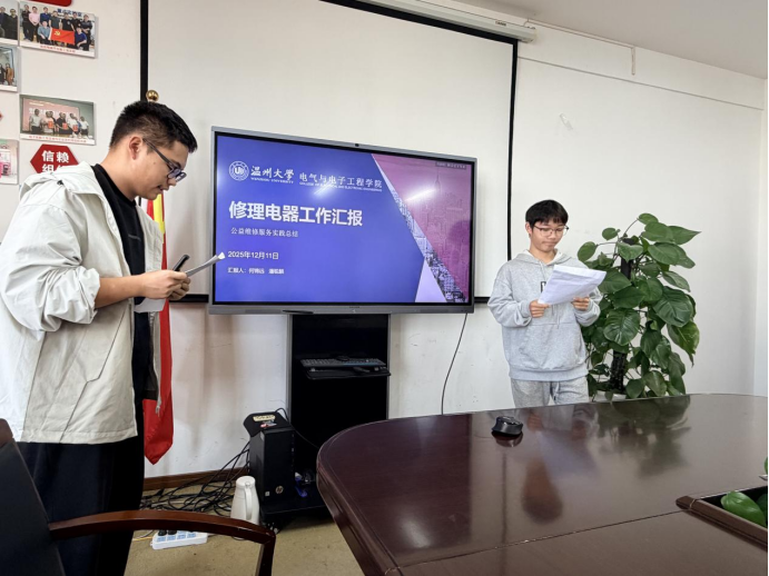 在公益维修服务总结汇报会上,团队成员回顾了本次电器义务维修活动。在实践中,同学们深入周边社区设立服务点,为居民维修电风扇、台灯等各类小家电。他们不仅运用知识排查故障,更在服务中耐心讲解安全用电常识。汇报会上,团队通过生动的案例,展示了从诊断问题到完璧归赵的全过程。这一公益维修活动,不仅为居民群众解决了实际困难,更让同学们在“做中学”,锤炼了扎实的实践动手能力和服务奉献精神。
