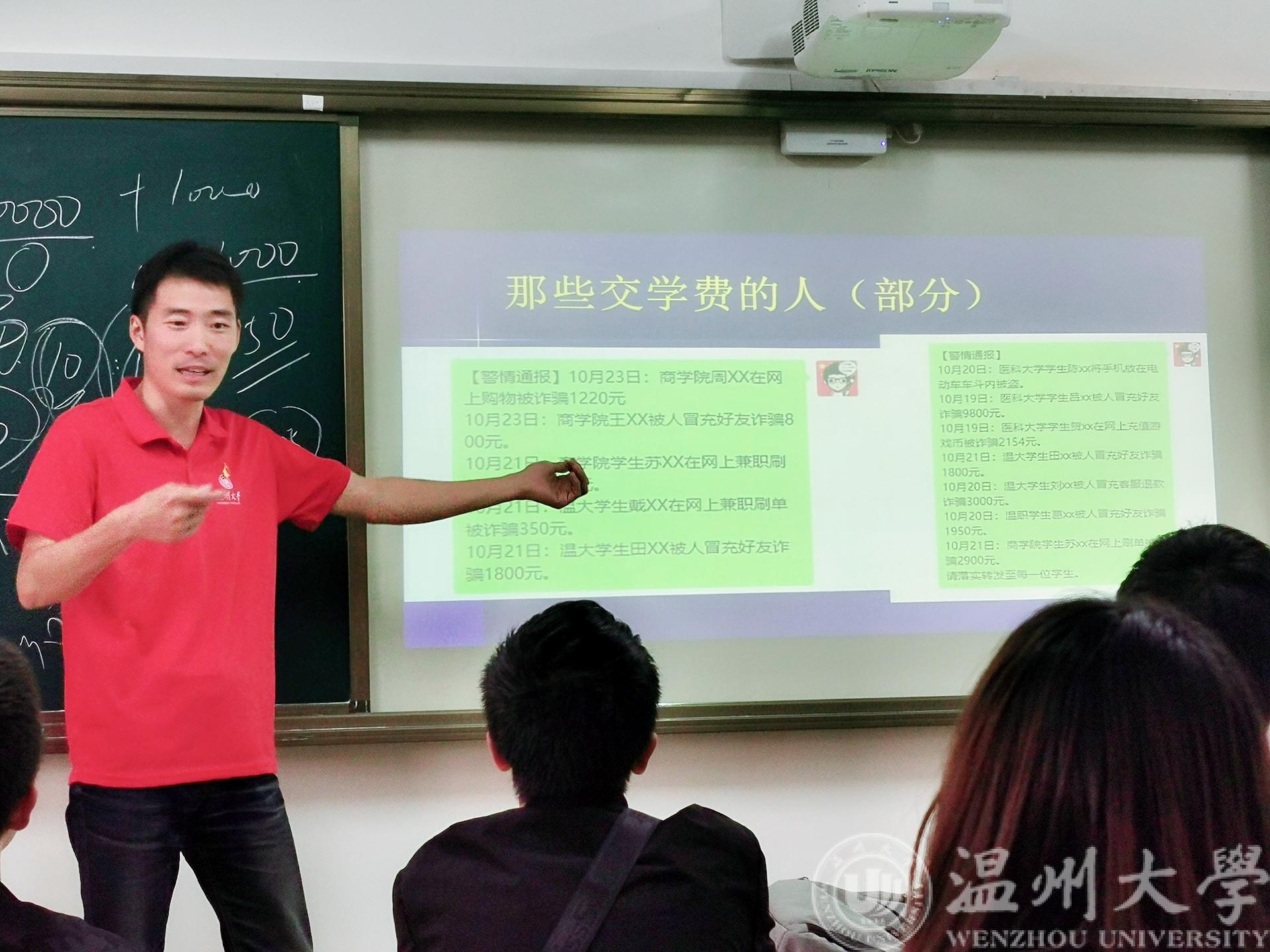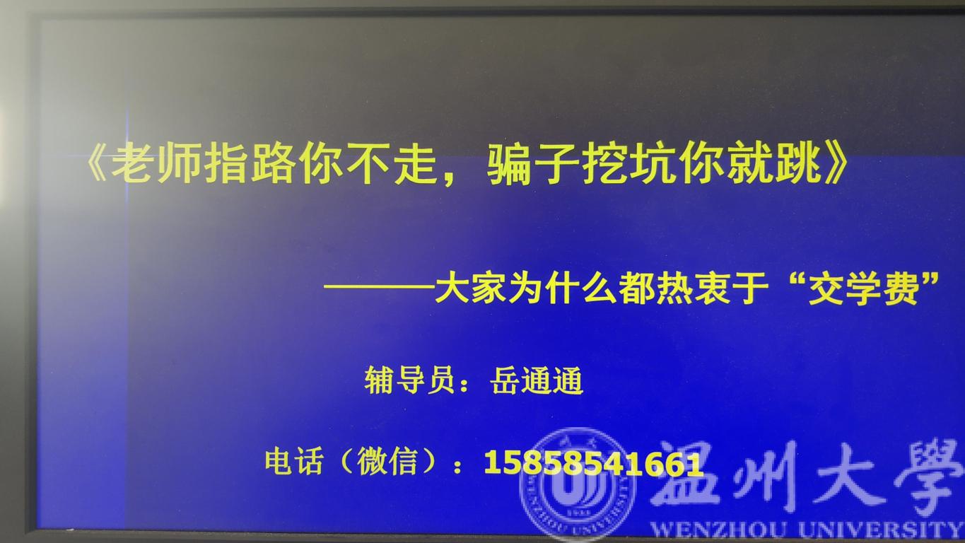 班会伊始,岳老师首先针对近期网络上、校园内发生的新兴诈骗事件给予通报,特别对网络上“套路茶叶女”“班级成绩邮件”“班级奖助学金领取发放”“出国进修学习报名”“网络兼职刷单”等典型案例进行解读分析。岳老师指出,校园安全案件近期呈现出新的特点,诈骗手段不断升级、诈骗套路不断变化,诈骗剧本更加严谨精细,受诈骗群体不断扩大。老师告诫在场学生,安全意识要实时提高,不断升级自己的“软件”,“多走老师指的的勤苦路,不入骗子挖的舒服坑”,建议同学同时把自己学到的一些安全事件,分享给自己的父母与亲朋好友,在提升自己安全意识的同时,也要看好父母的“钱袋”,少给骗子“交学费”。
