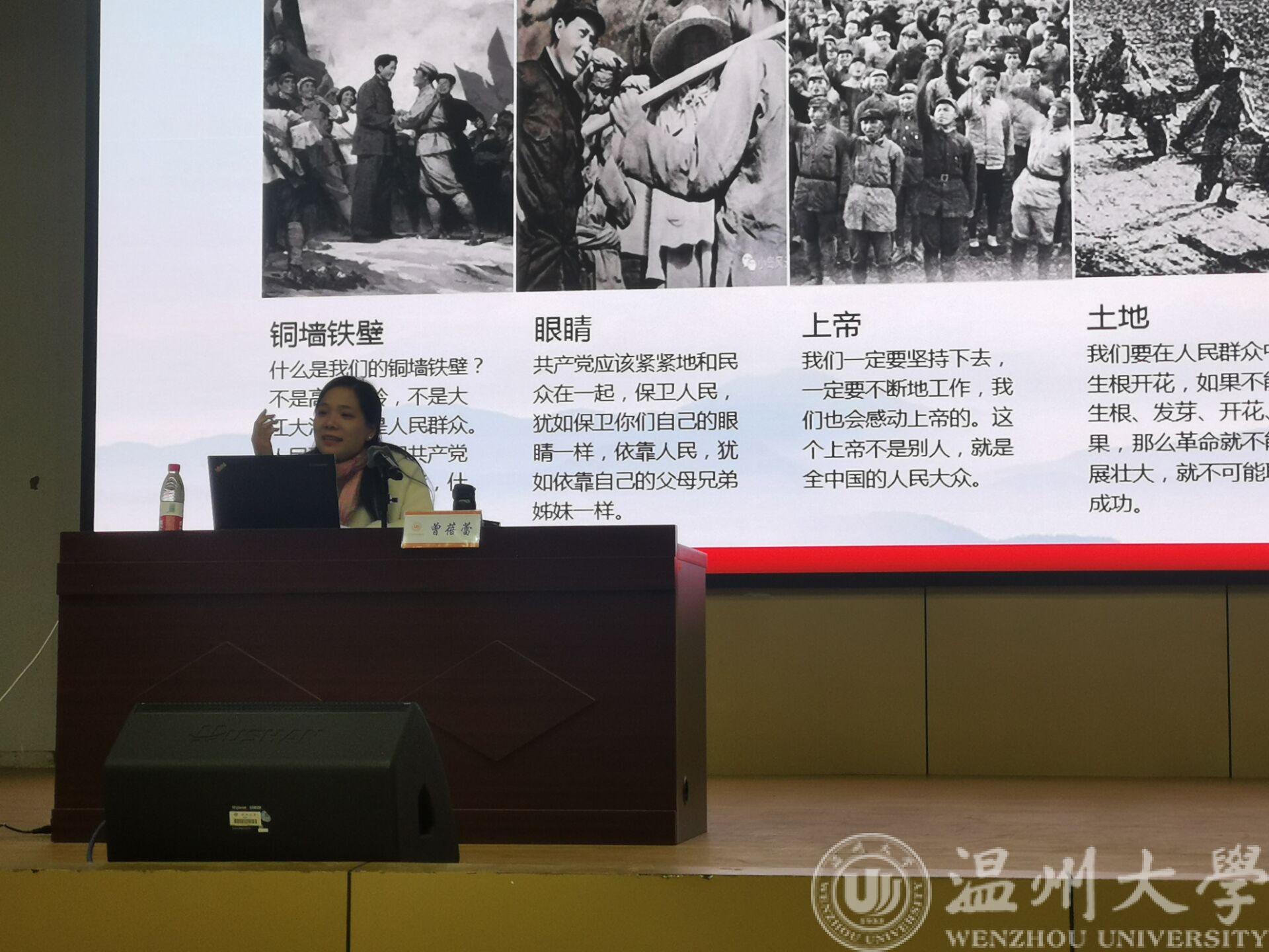 晚上7点整,曾蓓蕾老师以"不忘初心,继续前进""不忘初心,牢记使命"的话题开始讲述,着力表现了中国共产党成立以来面临的艰辛。中国共产党在民族危难之际怀揣初心,肩负梦想而来,正是中国共产党初心不改,才筑起了坚不可摧的血肉长城,筑起了坚强不屈的民族脊梁。之后,曾蓓蕾老师讲到习近平总书记在庆祝改革开放40周年大会上讲的中华民族实现伟大复兴的三个里程碑:中国共产党成立、中华人民共和国成立、推进改革开放和中国特色社会主义建设,这都是自改革开放以来中国发展的重大事件。讲座中途,曾蓓蕾老师以一首抒情的歌带动现场气氛,同学们回以热烈的掌声。在讲座的最后,曾蓓蕾老师给同学们留了一个思考题:"每一位普通大学生的初心和使命是什么?如何坚守?"希望同学们能够认真思考这个问题,并对同学们寄予了殷切厚望。