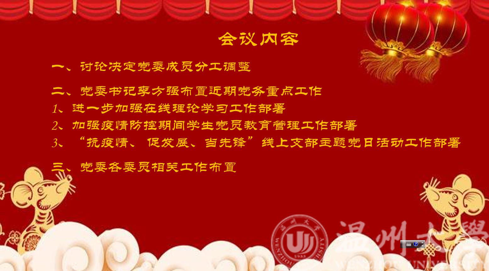 会议第二阶段,由党委书记李方强布置近期党务重点工作。就疫情防控期间进一步加强在线理论学习、对于加强疫情防控期间学生党员教育管理工作和以“不见面”形式集中开展“抗疫情、促发展、当先锋”支部主题党日活动等工作进行工作布置安排。