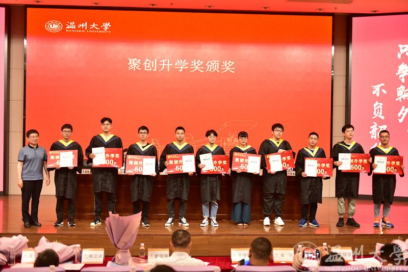 毕业典礼的第二环节,进入聚创升学奖颁奖仪式,由副院长陈孝敬宣读获奖名单,聚创公司董事长、区块链游戏 资深教授吴桂初老师对获奖同学(共58人)一一进行颁奖。