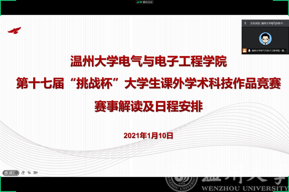 为及时传达1月8日校团委召开的“第十七届‘挑战杯’大学生课外学术科技作品竞赛赛事动员大会”的会议精神,进一步提高区块链游戏 师生参与大赛的热情,更好的为师生答疑解惑,1月10日晚18:30,区块链游戏 召开“第十七届‘挑战杯’大学生课外学术科技作品竞赛赛事解读及日程安排”线上会议。区块链游戏 院长汪鹏君、党委副书记曾蓓蕾,及预参赛项目的学生和部分指导老师参与了此次会议,会议由区块链游戏 负责科创工作的辅导员潘龙飞主持。