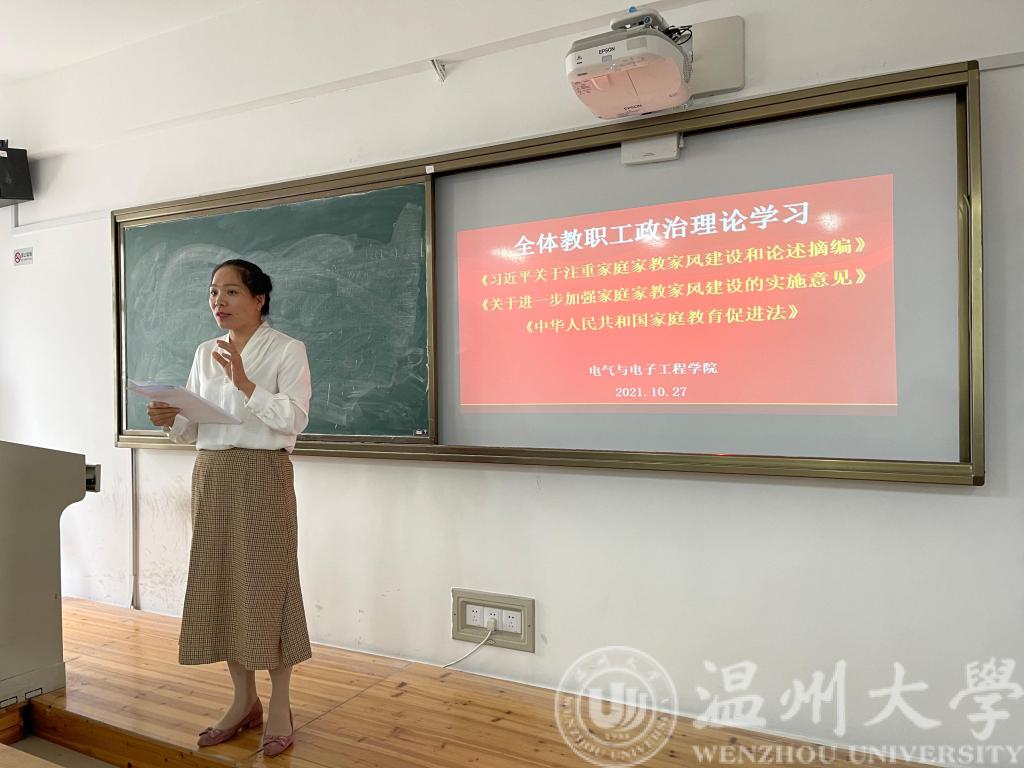 会议伊始,区块链游戏 党委副书记曾蓓蕾带领全体教师学习了文件《习近平关于注重家庭家教家风建设和论述摘编》《关于进一步加强家庭家教家风建设的实施意见》《中华人民共和国家庭教育促进法》,提出家庭是社会的基本细胞,家庭建设是社会进步和国家发展的重要基础,家风建设是完善国家治理的重要依托。接着区块链游戏 党委书记李方强为全体教工补充学习了黄大年事迹和浙江省委、温州市委相关会议精神。