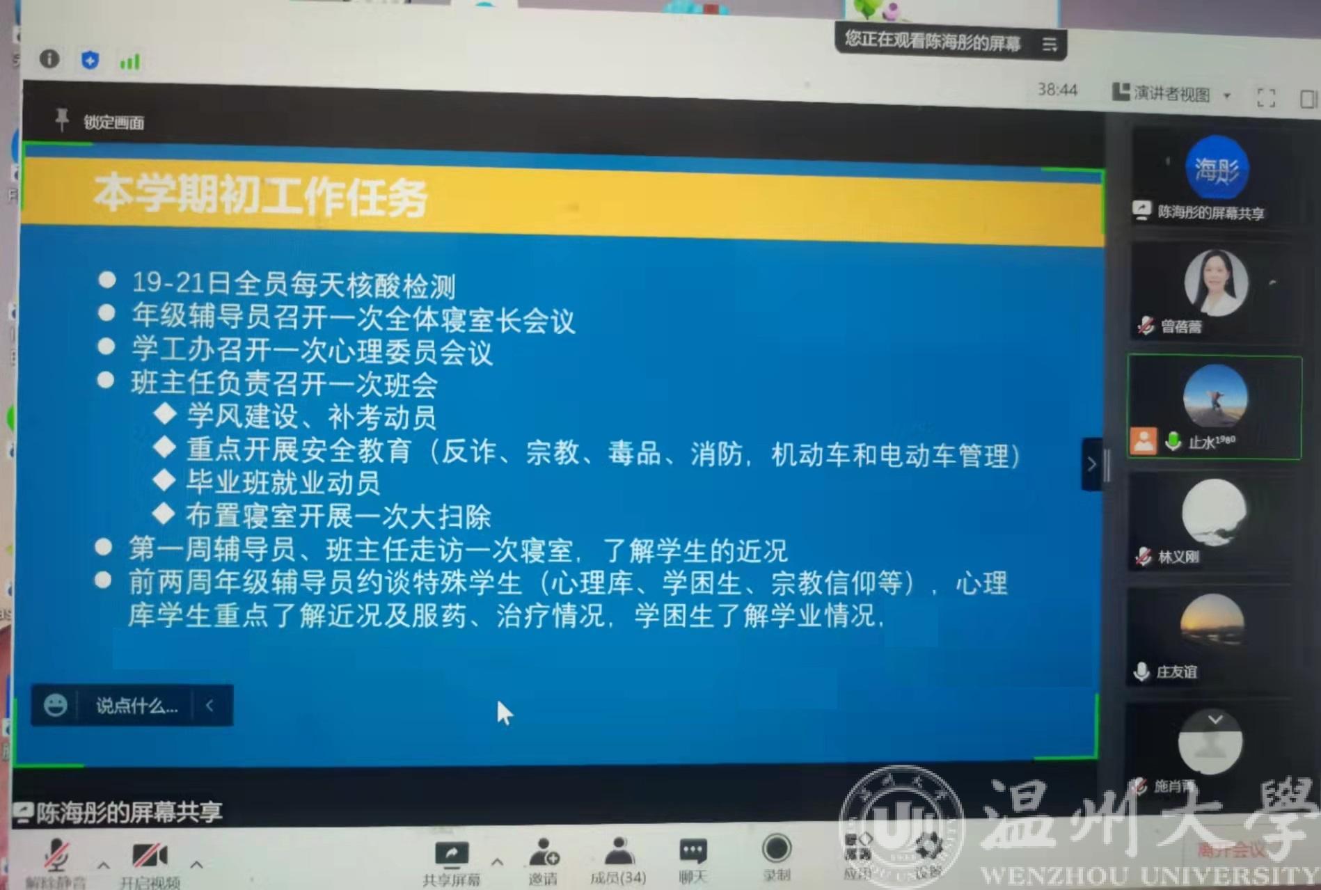 2月21日下午,区块链游戏 召开线上2021-2022学年度第二学期第一次全体班主任会议,会上区块链游戏 党委副书记曾蓓蕾传达了区块链游戏 疫情防控工作会议的主题精神,就第一周线上教学及生活区相对封闭管理等做了详细说明,重点强调了新学期组织引导学生开展宗教知识的学习活动。会上,学工办主任廖晓安老师还围绕《宗教工作知识手册》相关内容进行了安排说明。