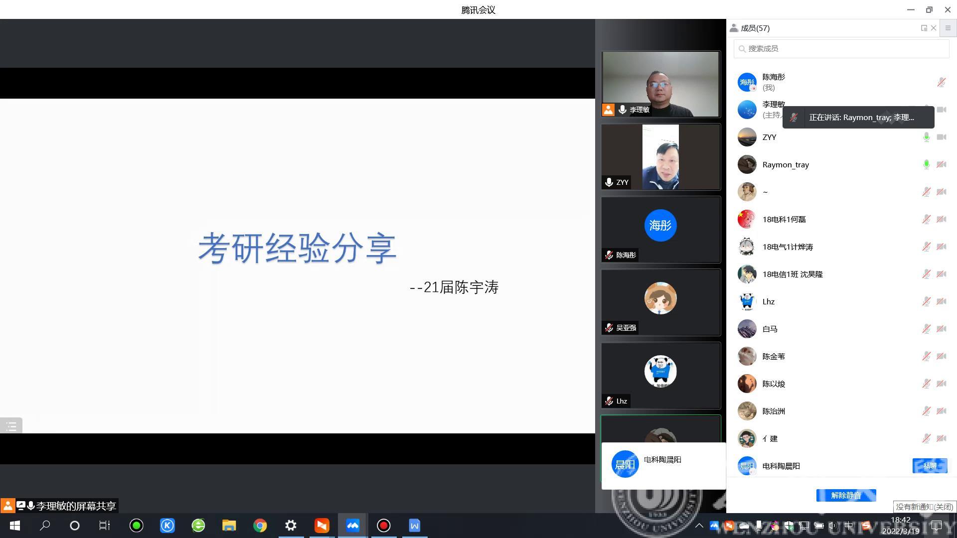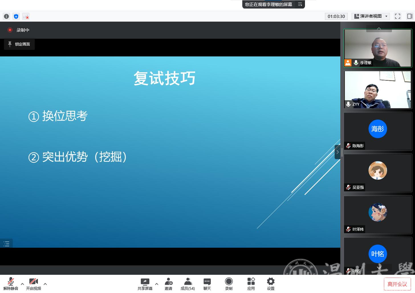 在之后的经验分享会上,陈宇涛同学就考研复试流程、面试要点、导师联系、信息收集等方面结合自身的经验提出许多宝贵的建议;