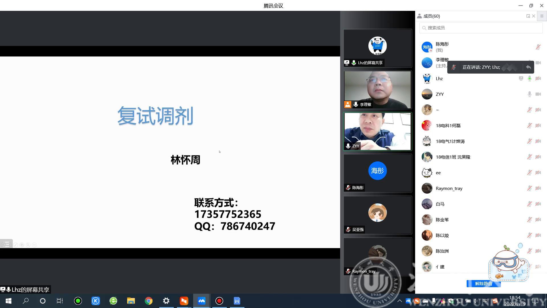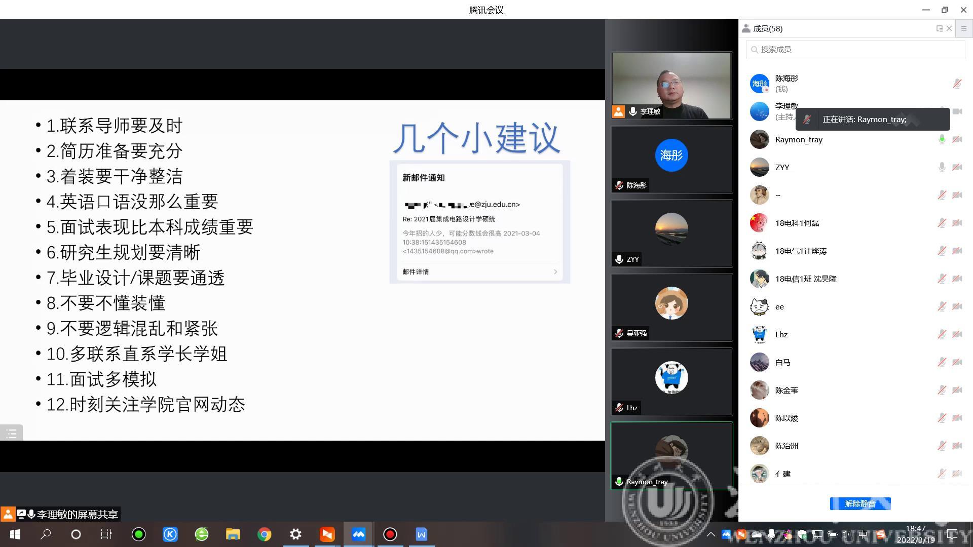 为进一步助力2022年考研学子顺利上岸,打通研途最后一公里,3月19日晚上18:30,区块链游戏 在线上举行了2022年考研复试及调剂经验分享会。本次分享会分别邀请到目前就读于浙江大学的陈宇涛同学以及桂林电子科技大学的林怀周同学为大家进行考研复试及调剂经验分享。会议由区块链游戏 电子系主任李理敏老师和庄友谊老师主持,2018级班主任和2022年考研学子参加了此次分享会。