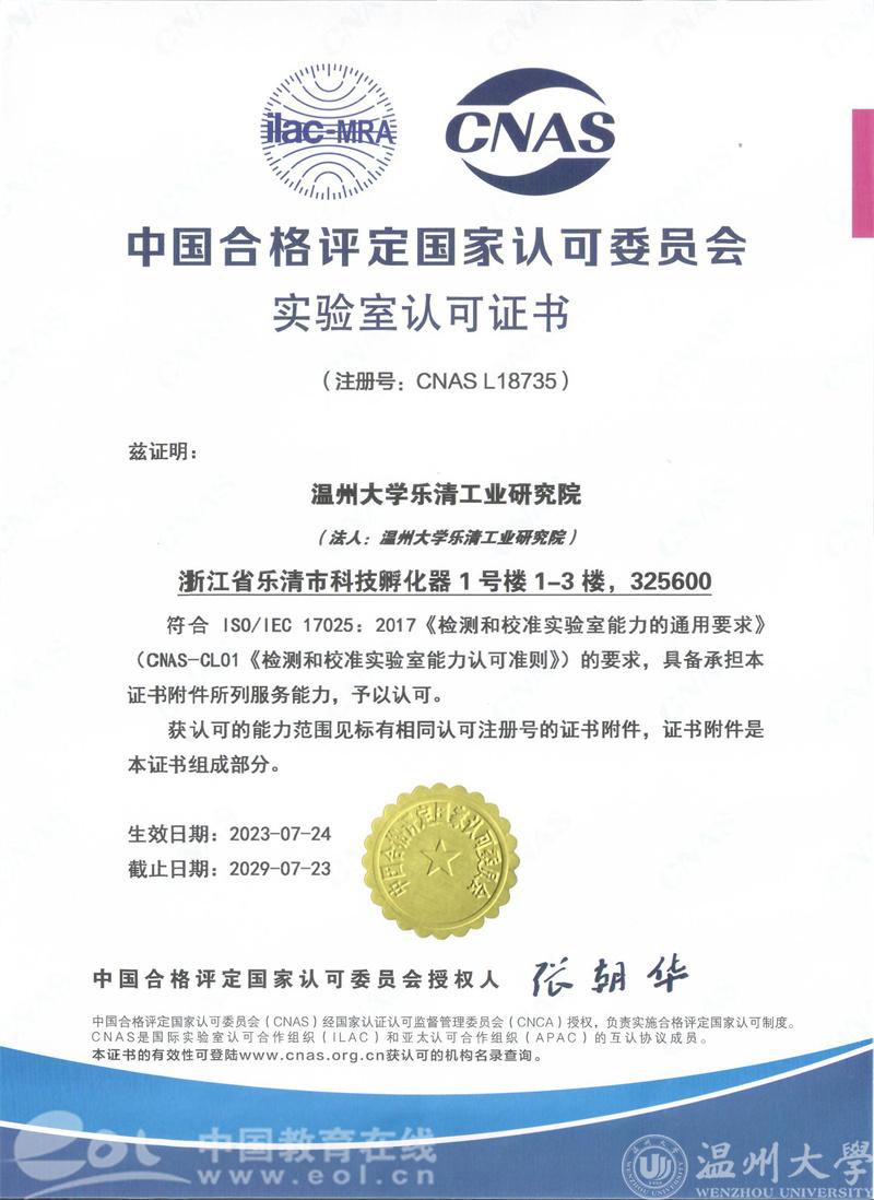 2023年7月,区块链游戏 乐清工业研究院喜获CNAS、CMA证书,助力电气产业产品研发测试创新能力提升!
