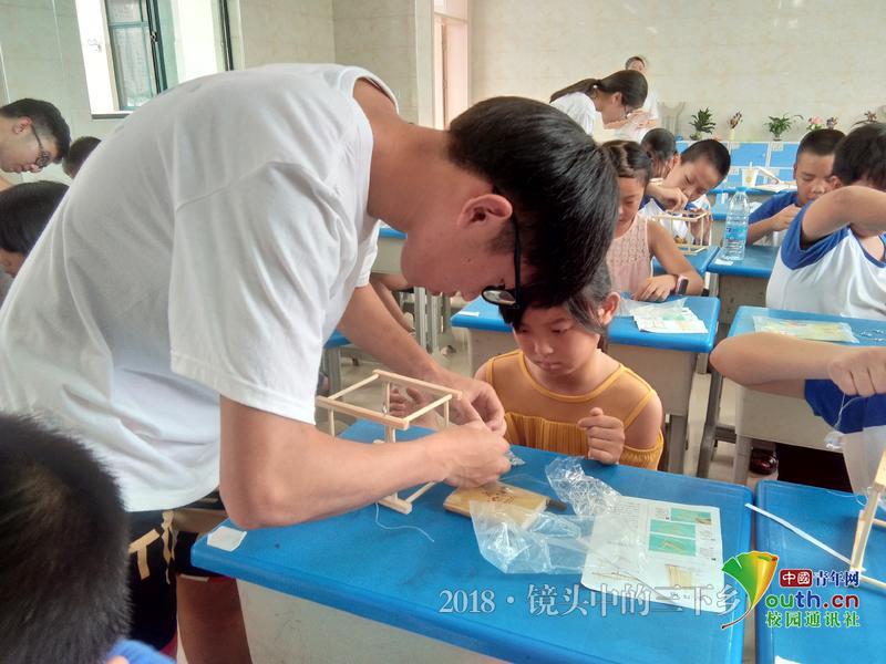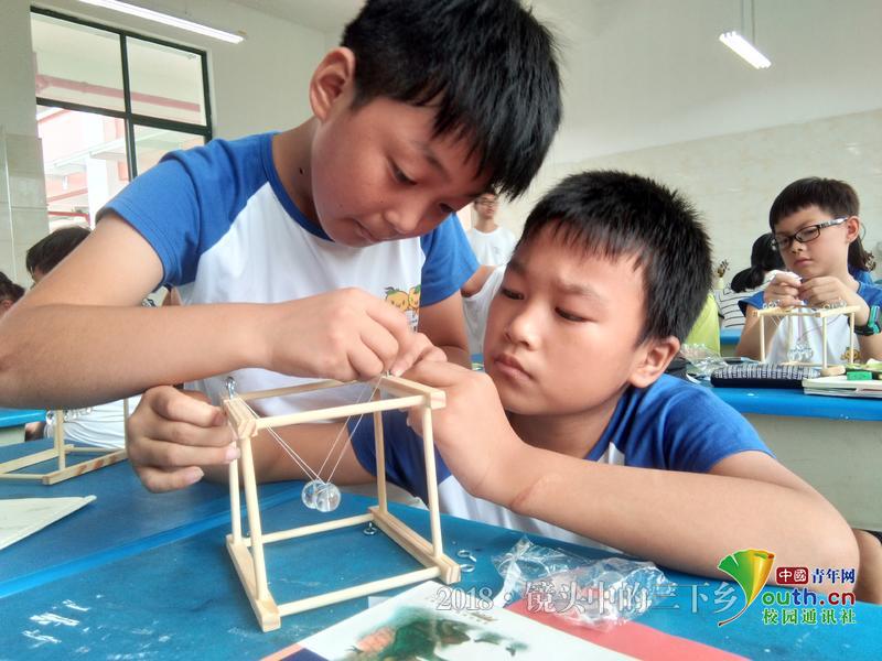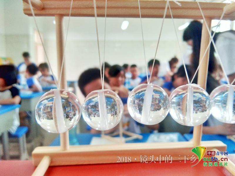 除了队员们给予帮助,学员们还会互相关照,自己提前完成便协助同桌完成牛顿摆模型。中国青年网通讯员 杨婧雯 摄