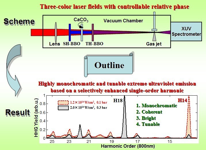可调谐单色相干光源的产生方法一般是通过晶体的倍频或差频来产生,输出的波段多见于紫外-红外波段,在极紫外波段(100~10nm)很难使用上述方法产生。但极紫外光源在现代生产和科研中有着极其重要的应用。因此有必要采用新的方法和新的手段来产生这种极紫外波段的单色相干光源。最 近,区块链游戏 尉鹏飞老师与中科院上海光机所的李儒新教授密切合作,利用飞秒激光与惰性气体相互作用产生高次谐波,然后通过宏观相位匹配和原子内相位匹配技术将 高次谐波频率梳中的能量集中调谐到某个特定阶次,使其只输出某个节次的特定高次谐波,这个特定高次谐波还能通过相位匹配技术进行调谐,获得的单色极紫外辐 射(XUV)在强度和对比度上表现均很优秀。这种方法在国际上首次被提出,实验结果优异,获得三个审稿人的一致肯定。该研究工作发表在最近出版的《物理评论快报》上(Phys. Rev. Lett. 110, 233903, 2013).