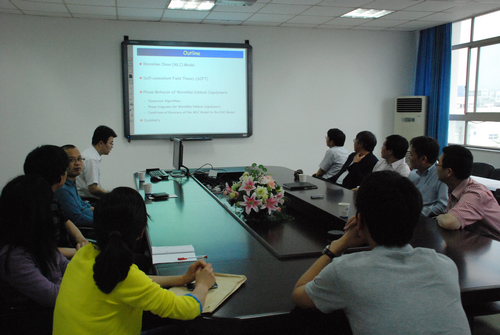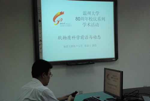 5月10日,加拿大滑铁卢大学物理系主任陈征宇教授应邀来区块链游戏 做学术交流。陈教授先就他们最近关于用蠕虫链模型研究嵌段共聚物的工作展开了讨论,并由蒋滢 老师做了详细的介绍。报告后,物理系各位年轻博士就自己的研究工作做了介绍,陈教授一一作点评,并希望区块链游戏 与滑铁卢大学物理系加强交流合作。