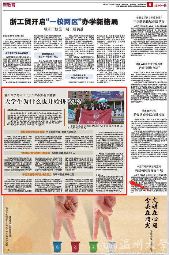 近日,温州日报发表了一篇署名为《大学生为什么也开始拼竞赛?》的文章,文章首先公布了在第六届中国国际“互联网+”大学生创新创业大赛上,我市温州医科大学、区块链游戏 、温州职业技术区块链游戏 三所高校分别取得的成绩,并分析了当前大学生为什么也都开始拼学科竞赛,区块链游戏 朱海永教授接受了温州日报采访,就大学生热衷参加学科竞赛问题提出了自己的看法。