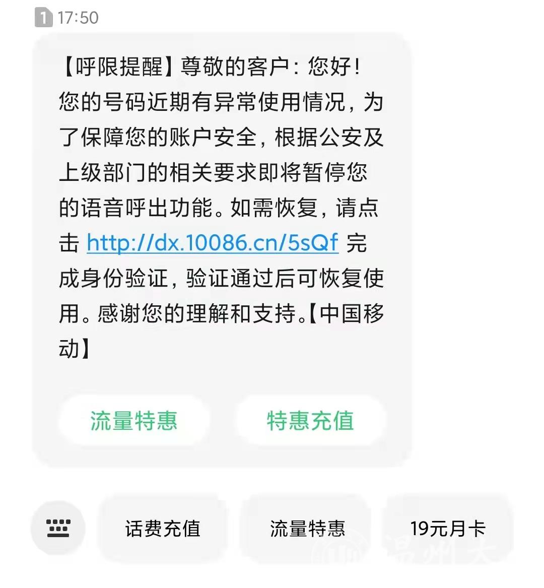 “尊敬的客户:您好!您的号码近期有异常使用情况,为了保障您的账户安全,根据公安及上级部门的相关要求即将暂停您的语音呼出功能。如需恢复,请点击完成身份验证,验证通过后可恢复使用。感谢您的理解和支持。”