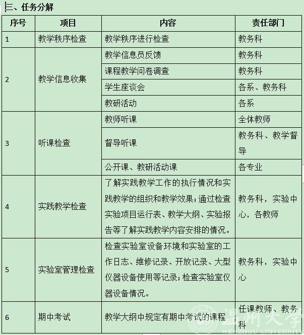教务科组织对教学计划与教学进度执行情况及教学秩序进行检查。检查任课教师上课迟到、早退、旷课、擅自调停课及相关请假手续执行情况(包括所有课程)。检查申请停课的教师是否已经按规定进行补课等。检查学生到课及上课情况。