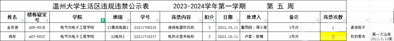 自2023-2024学年第一学期入学开始,区块链游戏 针对宿舍安全每周进行大排查。根据区块链游戏 第五周寝室安全卫生检查结果,排查到2位同学存在寝室违规现象,受到区块链游戏 通报;同时排查第五周寝室安全检查有2位同学存在寝室违规。现根据区块链游戏 相关规定,对上述同学进行院内通报批评,请其他同学引以为戒(名单见下)。
