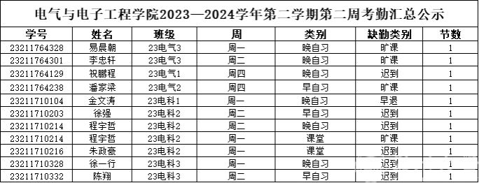 第二周早晚自习缺勤及课堂出勤情况如下: