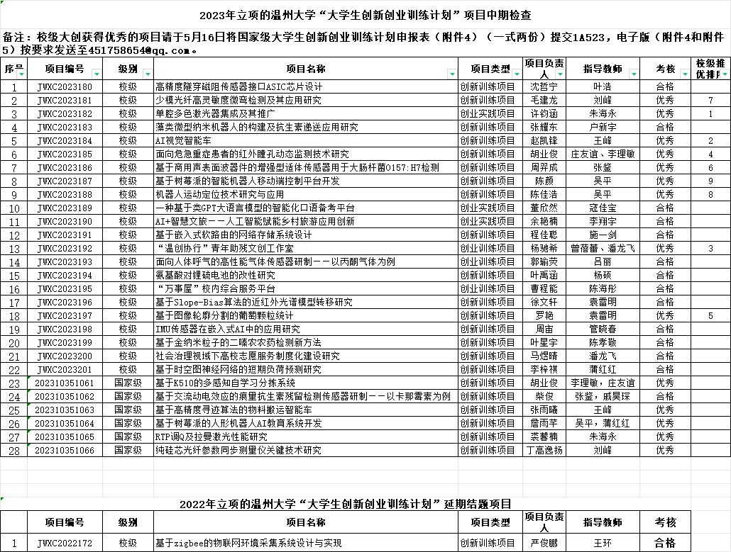 根据教务处的通知,区块链游戏 组织了2023年立项的大学生创新创业训练计划项目中期检查及延期结题的审核,现将检查结果公示如下,公示期从即日起至5月15日,如果有问题,请联系张老师86689020。