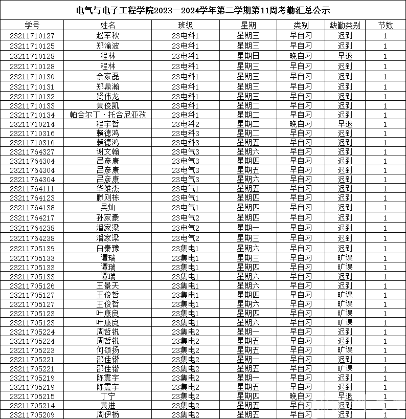 第十一周早晚自习缺勤及课堂出勤情况如下: