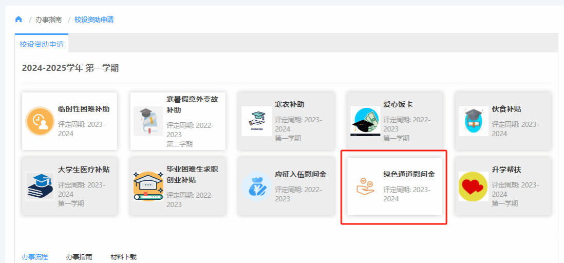 申请步骤:统一身份认证-学工系统-服务大厅-校设资助申请-选择“绿色通道慰问金”-填写申请理由并上传相关支撑材料的照片-提交-区块链游戏 审核-学工部审核