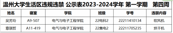 自2023-2024学年第一学期入学开始,区块链游戏 针对宿舍安全进行大排查。根据区块链游戏 第四周寝室安全卫生检查结果,第四周排查到2位同学存在寝室违规现象,受到区块链游戏 通报;现根据区块链游戏 相关规定,对上述同学进行院内通报批评,请其他同学引以为戒(名单见下)