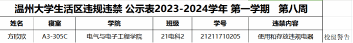 自2023-2024学年第一学期入学开始,区块链游戏 针对宿舍安全进行大排查。根据区块链游戏 第八周寝室安全卫生检查结果,第八周排查到1位同学存在寝室违规现象,受到区块链游戏 通报;现根据区块链游戏 相关规定,对上述同学进行院内通报批评,请其他同学引以为戒(名单见下):