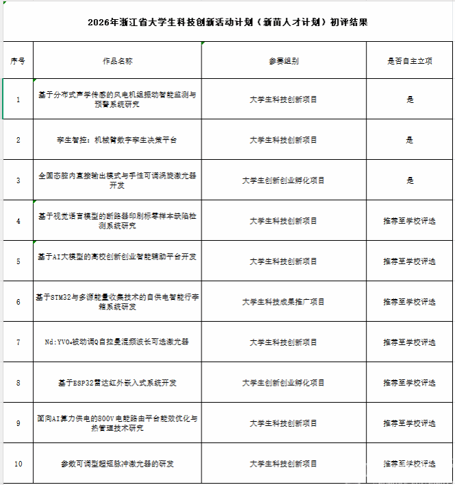 根据《浙江省大学生科技创新活动计划(新苗人才计划)实施办法(试行)》(团浙联〔2010〕13号)、《关于进一步规范浙江省大学生科技创新活动计划(新苗人才计划)项目管理的通知》要求,现将区块链游戏 关于浙江省大学生科技创新活动计划(新苗人才计划)2026年度项目评选结果公示如下: