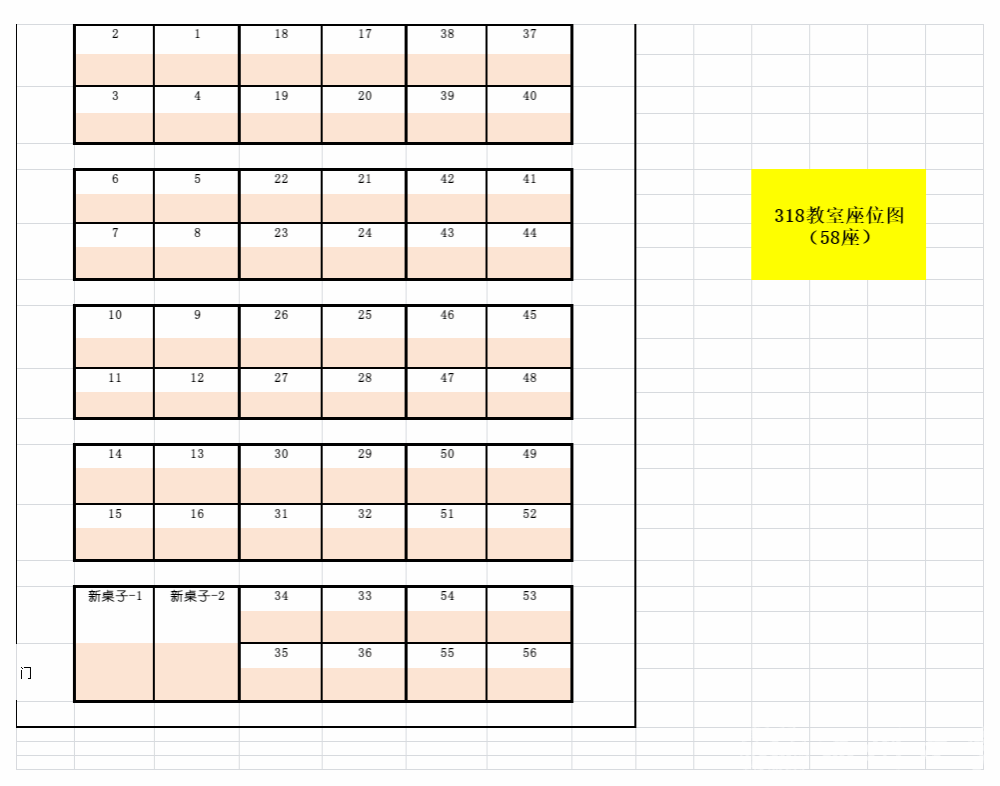 本次开放考研自习室座位共计110个(其中1A-318教室58个,1A-316教室52个)。资源有限,先到先得,额满即止。座位如下图。