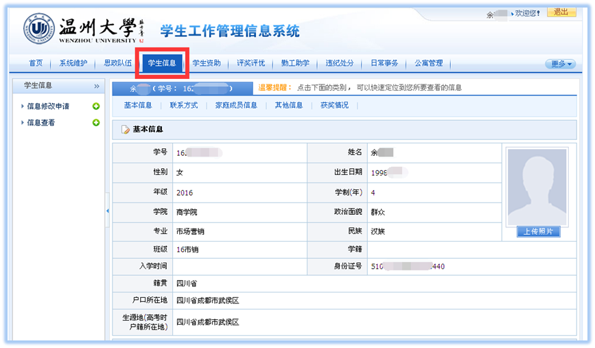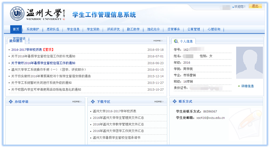 学工系统是贯穿大学生活的一个很重要的信息媒介。可在系统中的下载专区下载区块链游戏 相关的各类文件,可在系统中办理个人信息维护、学生干部职务申请、评奖评优申请、各类资助申请、勤工助学岗位申请、勤工助学工资发放、日常事务(假期管理、假期留校申请、场地申请)等。请新老生同学们尽快将学工系统中的个人信息进行维护,并在以后的大学生活中将信息不断更新,以便不影响在校期间接受各类紧急信息及各项事务办理。个人信息维护示意图如下: