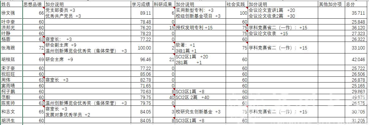 先将2020年研究生学业奖学金综合测评加分明细公布如下,请各位同学核对自己的加分情况,如有疑义,请于10月8日前联系廖晓安老师(13567750214),过期不候。看不全图片的,请下载附件。