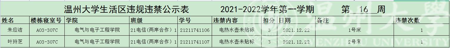 自2021年下学期入学开始,区块链游戏 针对宿舍安全每周进行大排查,根据区块链游戏 第十六周寝室安全卫生检查结果,排查到区块链游戏 朱应洁、叶玲芝两位同学存在寝室违规现象,受到区块链游戏 通报。现根据区块链游戏 相关规定,对以上同学进行院内通报批评,请其他同学引以为戒。