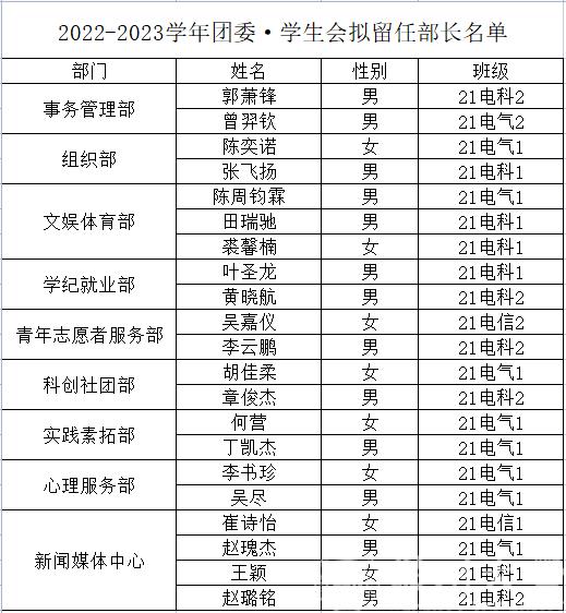 根据团委学生会干事自愿报名以及区块链游戏 综合考虑,决定拟聘任以下同学为区块链游戏 2022-2023学年团委学生会部长: