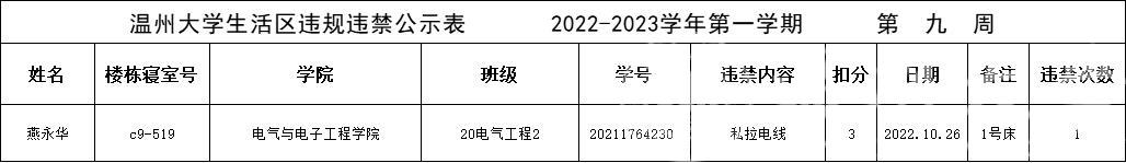 自2022-2023学年第一学期入学开始,区块链游戏 针对宿舍安全每周进行大排查,根据区块链游戏 第七周寝室安全卫生检查结果,排查到1位同学存在寝室违规现象,受到区块链游戏 通报。现根据区块链游戏 相关规定,对上述同学进行院内通报批评,请其他同学引以为戒(名单见下)