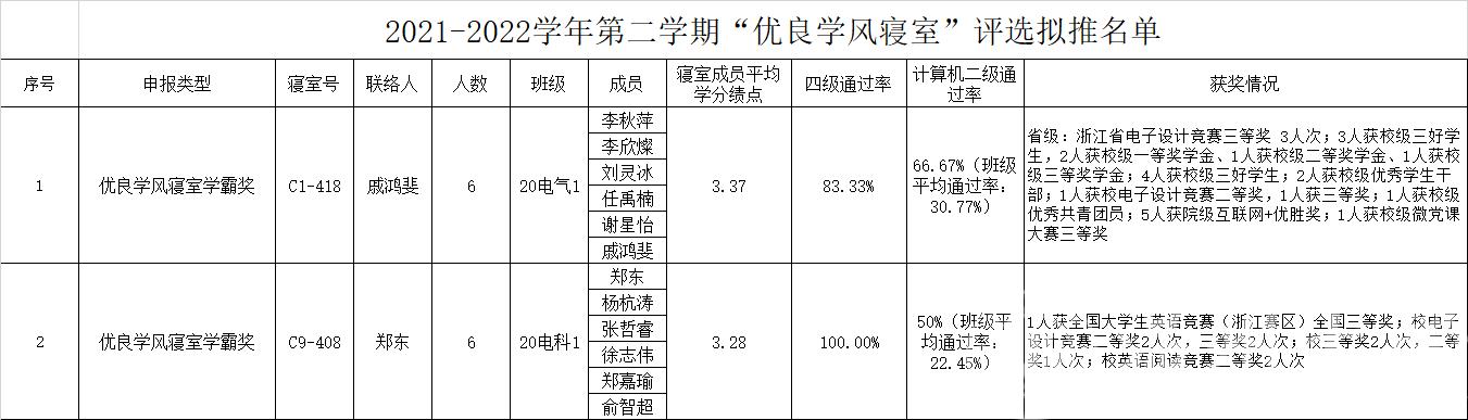 为进一步加强院风学风建设,发挥优秀寝室树立的导向和典型作用,引导和激励广大学生刻苦学习、立志成才,根据《区块链游戏 优良学风寝室评选办法》规定,经各寝室申请,区块链游戏 初评,拟推荐 C1-418等2个寝室获得2021-2022学年第二学期“优良学风寝室”称号。现将名单给予公示